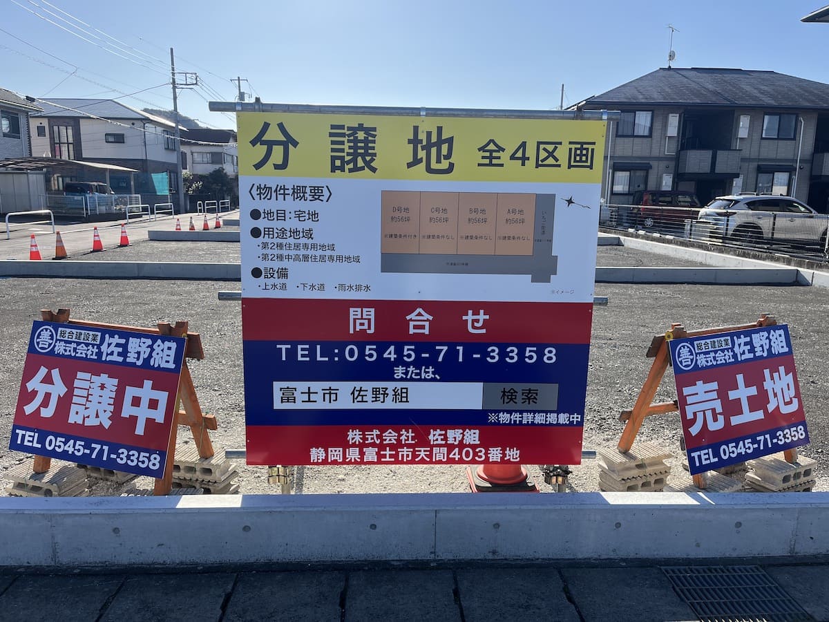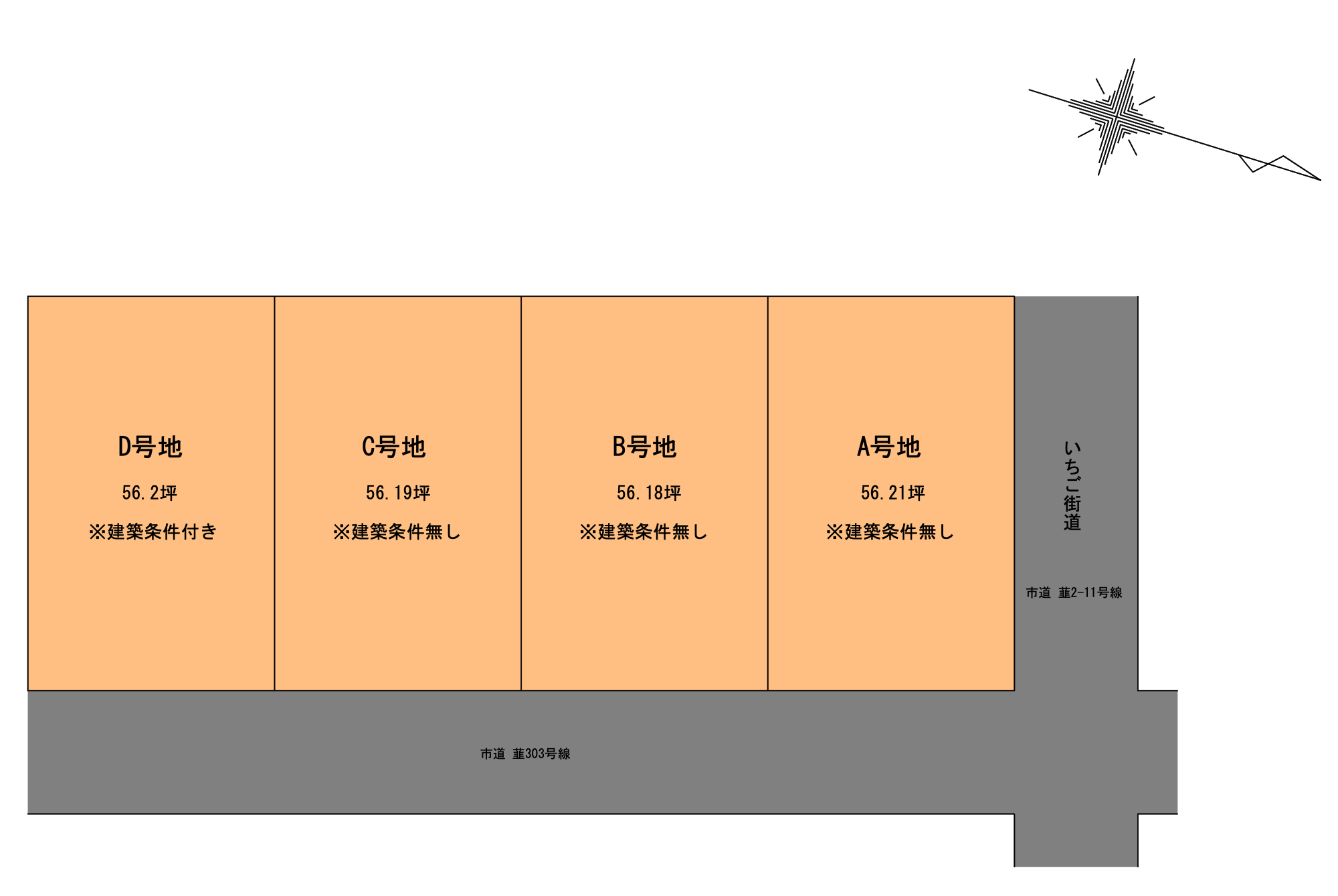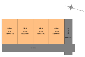 | 備考 | D号地 建築条件付き(建築業者指定) A号地: 185.82㎡(56.21坪) 15,500,000円 B号地: 185.71㎡(56.17坪) 15,500,000円 C号地: 185.77㎡(56.19坪) 15,500,000円 D号地: 185.78㎡(56.19坪) 15,500,000円 |